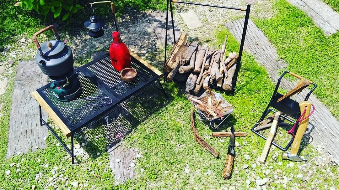 薪置き、ドライフラワー、エアープラン、キャンプ道具の引っ掻け、お店の看板の足